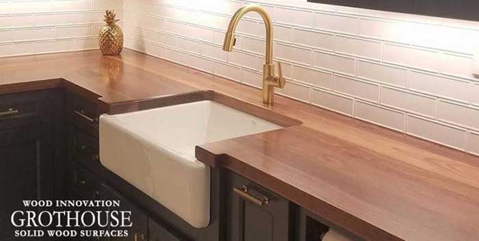 Grouthouse’s wood countertops and solid wood surfaces are crafted from a virtual forest of wood choices and come in an array of edge profiles, and design options. The butcher block countertops are sealed with Grothouse Original Oil and perfect for an aesthetic and functional food preparation surface. Grothouse wood bar tops are used in commercial and residential bars throughout the United States. Their exclusive Durata Finish assures a protective waterproof surface. All items are custom made in the USA by master craftsmen. Visit our showroom to view this gorgeous countertop option.
